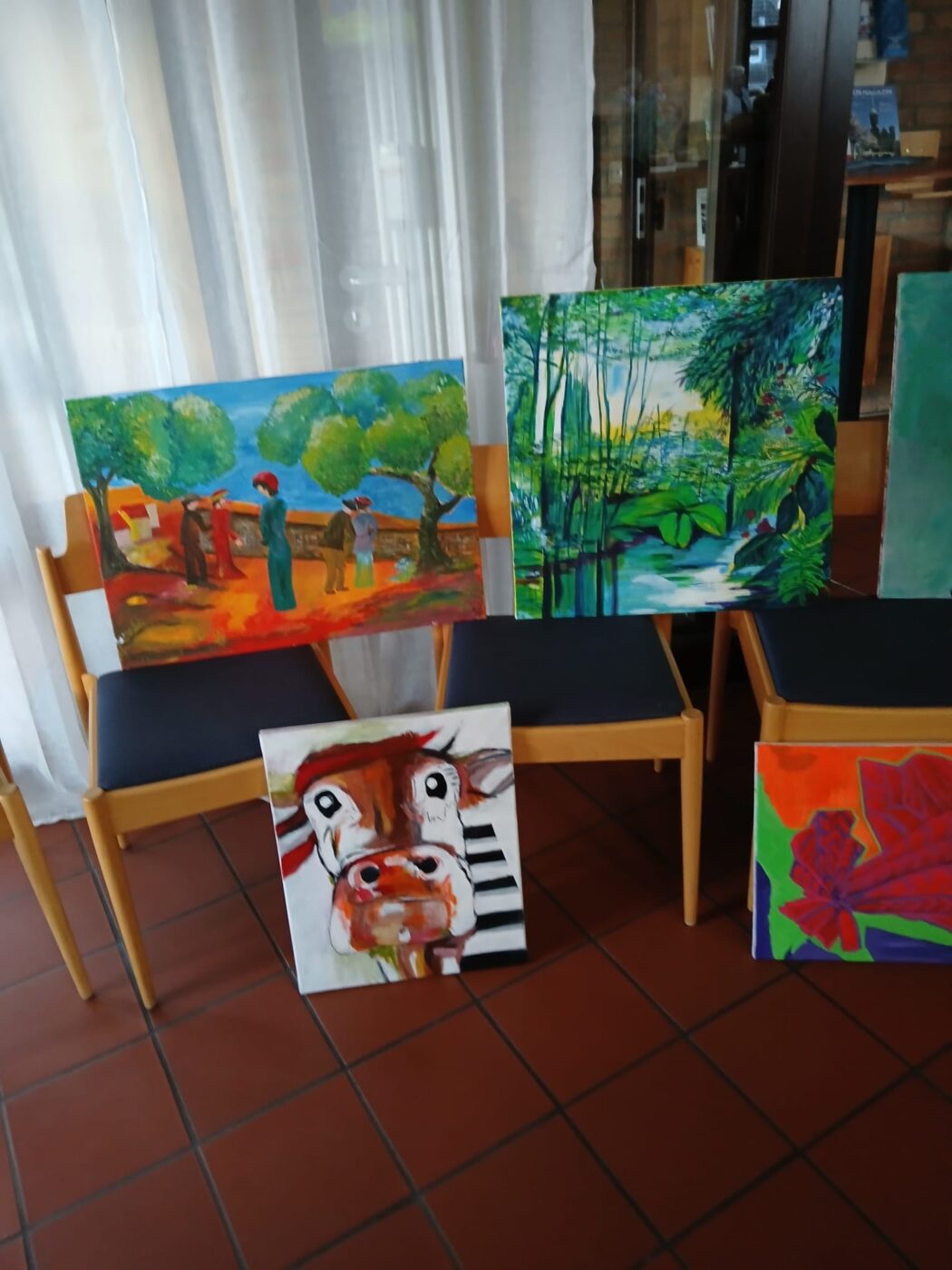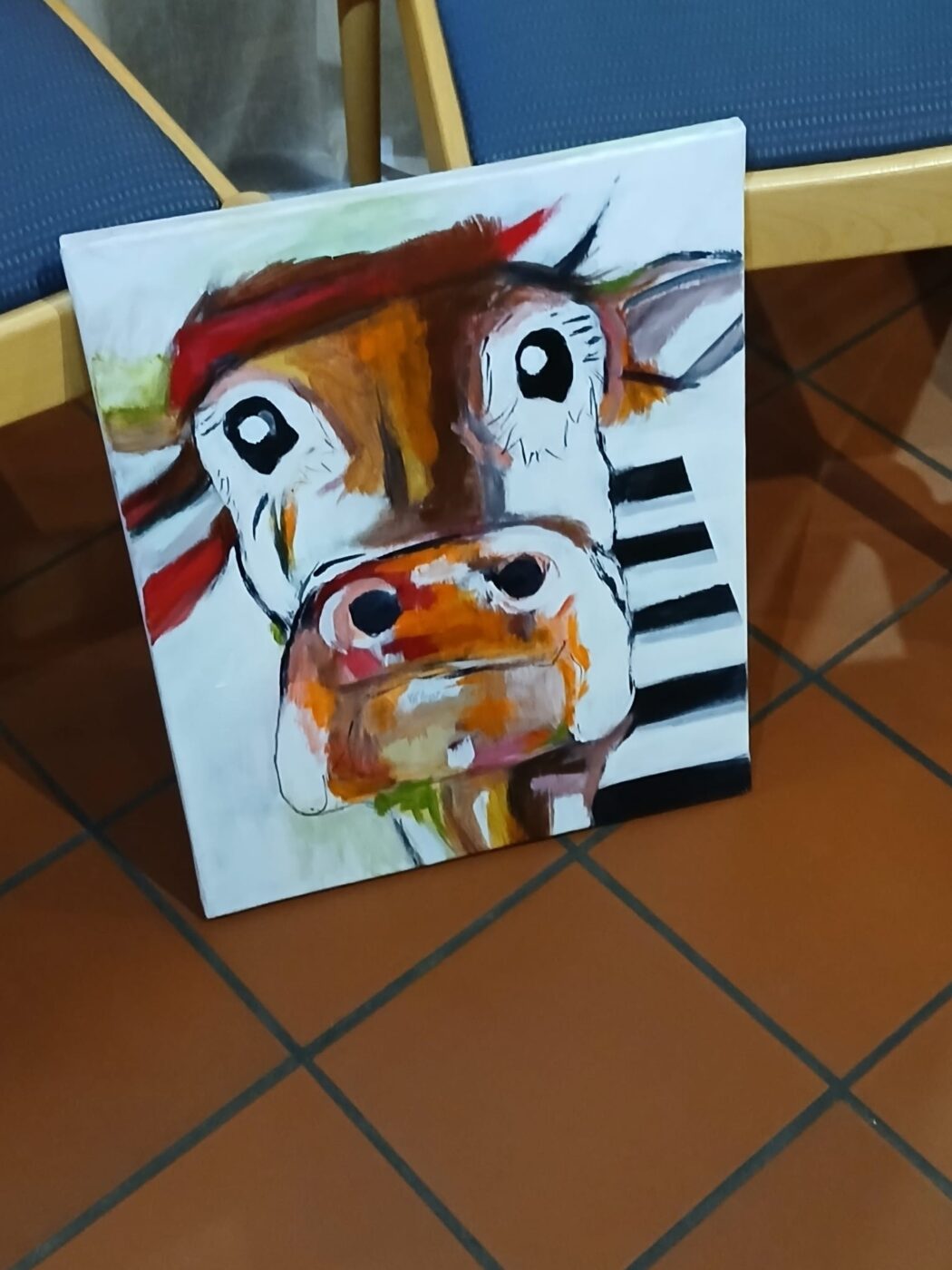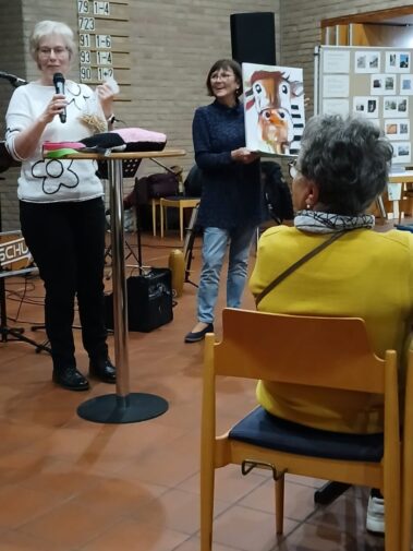 Bunt waren natürlich auch die ausgestellten Gemälde unserer talentierten Acryl-Malerinnen. Ganz besonders bunt waren die beiden Preise unserer Verlosung, das Porträt einer wunderbaren Kuh, erstellt von den Damen der Malgruppe, sowie eine sehr hübsche Strick-Patchwork-Tasche unserer Strickgruppe.