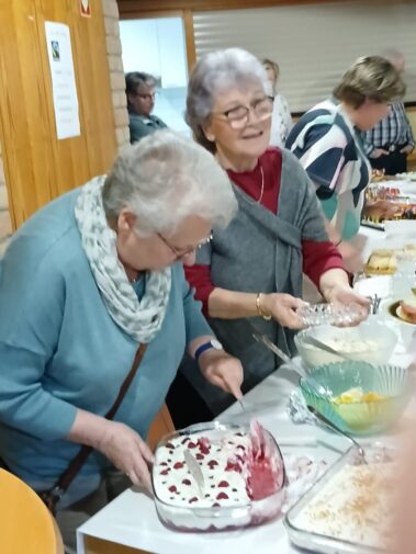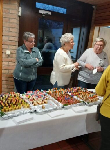 Bunt waren die vielen. toll dekorierten leckeren Häppchen unserer Kochgruppe, dazu noch verziert mit vielen Fähnchen, bunt die köstlichen Desserts, der Obstsalat und die Kuchen.